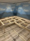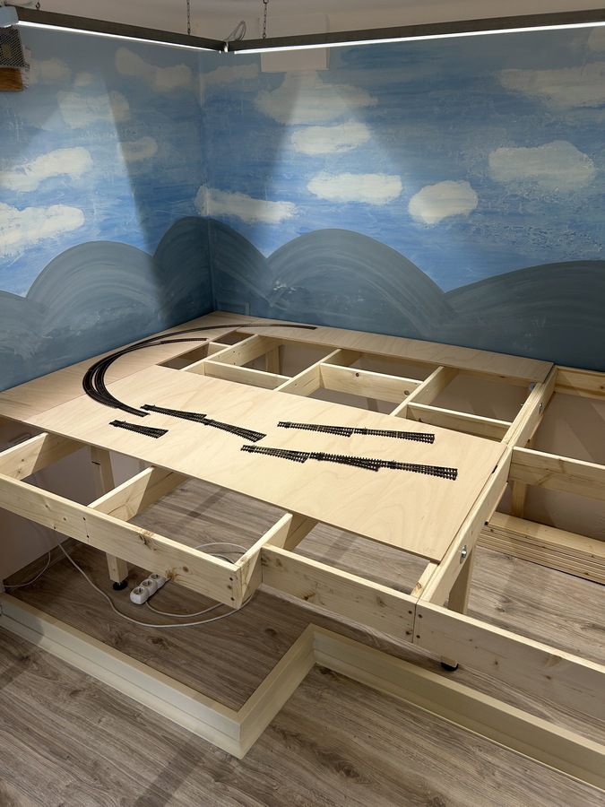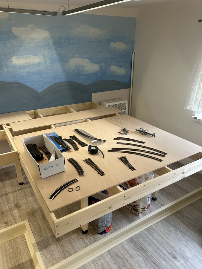 Na tomto obrázku vidíte finálny vzhľad, už iba zostaviť rámy a môžem začať stavať koľajovú cestu. Rámy ešte plánujem teraz no koľajovanie ma čaká až ku koncu jesene, lebo cez leto je človek iným živ. Isto vášmu pohľadu neuniklo maľované pozadie na stene, no nepodarilo sa mi to podľa predstáv, mal som toho opakovaného pretierania už plné zuby a tak som to nechal tak, lebo horizont sa bude dorábať až bude položené všetky koľaje a všetky poschodia a potom možno skúsim ešte doladiť aj tu oblohu. Uvidíme ako to potom ukáže...