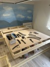 Prikladám ešte pár ďalších obrázkov hotového rámu, kde už skusmo pokladám preglejku a čarujem s koľajami, že či som si to dobre navrhol. Stavbu koľajovej cesty mám však v plánu až na jeseň ...