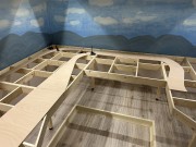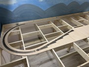 Rám sa skladá z dvoch častí o rozmeroch 125 x 90 cm. Spolu teda vzniká plocha 250 x 90 cm, kde by sa malo rušňové depo vojsť. Pri stavbe rámu som zvolil podobnú metódu, ako pri stavbe rámu na dedovo enko a naviac som tento nový rám obohatil o pár drobností, ktoré mi na enkovom ráme chýbajú. Základným materiálom je 12 mm buková preglejka, ktorú som si dal presne narezať a potom už stačilo pár hodín a bolo to! Spoje sú šróbované a lepené. Priečne laťky som spravil o 2 cm užšie a tým vytvárajú akúsi oporu pre styrodurovú dosku, ktorá je do dreveného rámu vložená a vlepená. Na obrázku 003 je to veľmi dobre vidieť a na obrázku 007 je veľmi dobre vidieť vloženie styroduru.