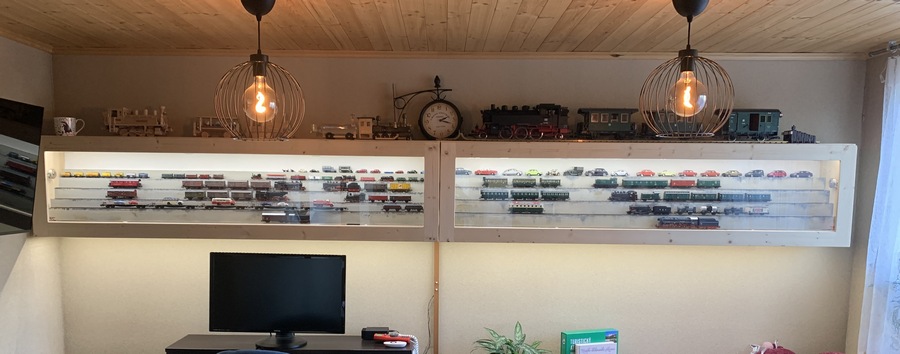 Myšlienka „akonato“ bola vyrobiť tri kusy drevených presklených vitrínok so sklenenými policami, ktoré budú zavesené nad Dedovým Enkom tak, aby nerušili pohľad na koľajisko, ale aby boli tiež stredobodom pozornosti náhodných okoloidúcich. Taktiež som vedel, že modely vnútri budú nasvietené a samotné vitrínky budú súčasne slúžiť ako osvetľovacie telesá pre dolu umiestnené koľajisko. Verte – neverte = vono sa to všetko podarilo zrealizovať do bodky a ešte aj s čerešničkou, ktorá práve tie oči teší ...