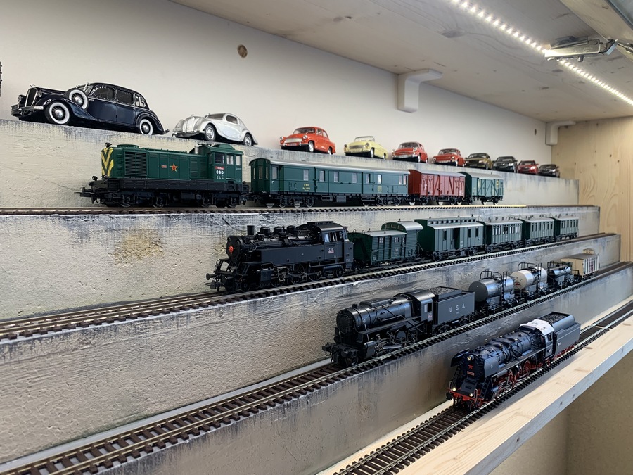 Vitríny sú dve, zo smrekovej laťovky, zadná stena biely sololit, predná časť je opatrená vyklopnými presklenými dvierkami. Kaskády (poličky) vnútri sú z polystyrénu a styroduru, v pohľadovej časti vytmelené a natreté betónovou farbou s miernou patinou. Dolné dve koľaje sú napojené na centrálu a slúžia na občasné prebehnutie doprava a doľava. Jedna z koľají tiež slúží ako programovacia, kde si po zakúpení modelu upravujem CV, aby som náhodou plnou parou nepoškodil modely o boky vitrín. No a celé je to samozrejme nasvietené.